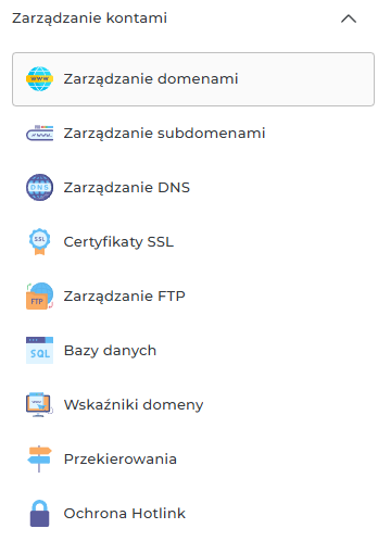 Kiedy już wiesz że domena docelowa dodana jest do konta, przejdź do zakładki Zarządzanie kontami > zarządzanie DNS,