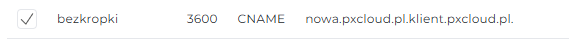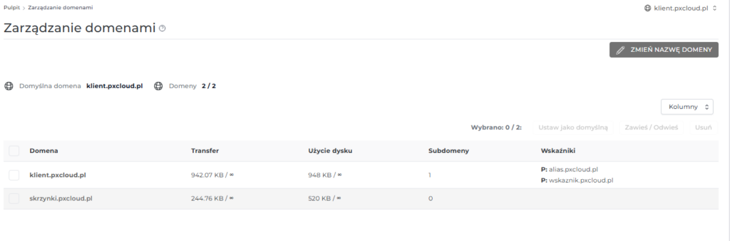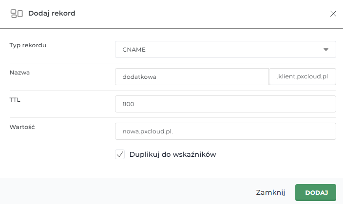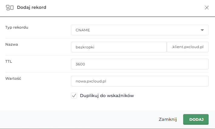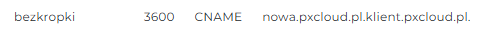 W efekcie, nasz system doklei automatycznie nazwę domeny, w tym przypadku klient.pixelcloud.pl.