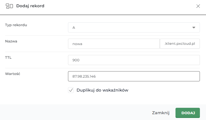 Dodanie rekordu następuje poprzez przyciśnięcie zielonego przycisku Dodaj Rekord, otrzymasz wówczas dostęp do formularza, który pozwoli Ci na dobranie typu rekordu, jego TTL czyli czasu odświeżania, nazwy oraz wartości.