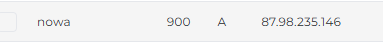 Dla przykładu skierujemy nową subdomenę o nazwie nowa na adres IP serwera s2 rekordem A. Wymusiłem dla tego rekordu mniejszy TTL, czyli czas odświeżenia, aby propagacja tej zmiany nastąpiła nieco szybciej. TTL jest liczony w sekundach, więc 900 sekund to około 15 minut. Domyślnie czas TTL w strefach DNS na naszych usługach to 3600 sekund, czyli godzina.