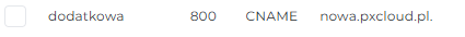 Dodajmy zatem kolejny rekord, tym razem CNAME jako cel wskazując naszą nową subdomenę nowa. Jak widzisz rekord CNAME wygląda nieco inaczej, bowiem zawiera on wartości tekstowe, a nie liczbowe jak rekord A.