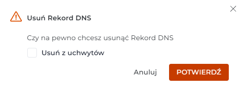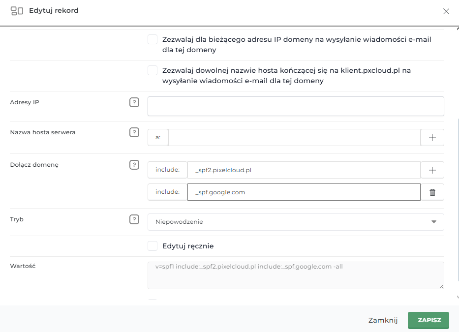 Pamiętaj, że w strefie DNS może być obecny tylko jeden rekord SPF dla domeny głównej, zatem konieczne będzie usunięcie domyślnego i dodanie nowego, lub modyfikację.
