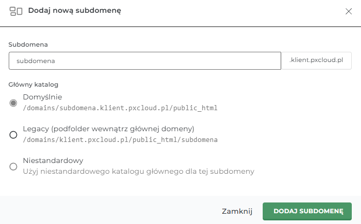 Sugerujemy wybranie opcji domyślnej, wówczas subdomena zostanie utworzona z całkowicie osobnym drzewkiem folderów.