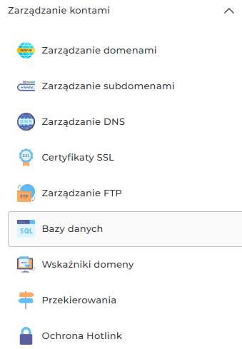 Zaloguj się do swojego konta hostingowego w panelu Direct Admin, proces ten opisany jest w tym miejscu. Skieruj się do zakładki Zarządzanie kontami > Bazy danych