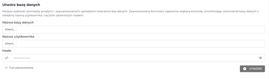 Jeśli jednak nazwa użytkownika ma różnić się od nazwy bazy, wybierz opcję Tryb zaawansowany. Wówczas uzyskasz możliwość wpisania własnego hasła oraz własnej nazwy użytkownika.