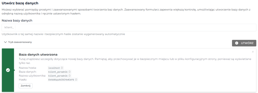Po wpisaniu odpowiednich danych kliknij przycisk Utwórz, co pozwoli na utworzenie nowej bazy oraz wyświetlenie komunikatu z jej danymi – które można przykładowo wpisać do pliku konfiguracyjnego wp-config.php w Twojej nowej stronie WordPress instalowanej manualnie.