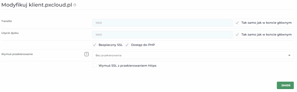 Oraz upewnij się że włączona jest opcja Bezpieczny SSL, oraz kliknij Zmień