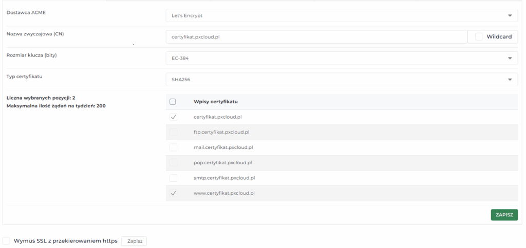 Oraz wybierz dla jakich subdomen certyfikat ma zostać wygenerowany. Domyślnie zaznaczone są jedynie domena główna oraz jej subdomena www, natomiast możesz wybrać dodatkowe.