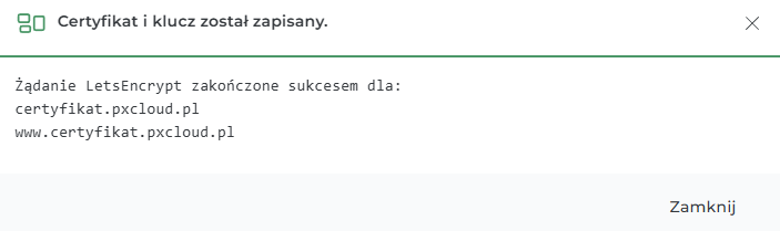 Zapisanie formularza spowoduje przystąpienie do generowania certyfikatu, po pomyślnym zakończeniu otrzymasz powyższy komunikat.