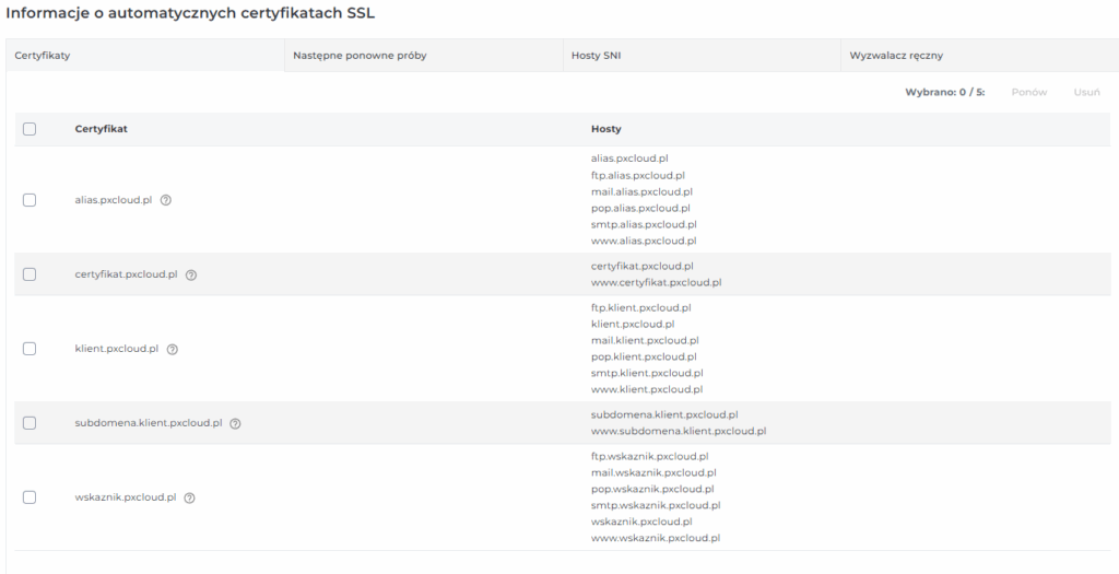 Na dole zakładki Certyfikaty SSL odnajdziesz tabelę z wygenerowanymi na koncie hostingowym certyfikatami. Wskazana lista pozwala na zarządzanie nimi, przykładowo usuwaniem lub ponownym generowaniem.